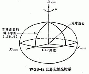 WGS-84坐标系(World Geodetic System一1984 Coordinate System)是一种国际上采用的地心坐标系。坐标原点为地球质心,其地心空间直角坐标系的Z轴指向BIH (国际时间服务机构)1984.0定义的协议地球极(CTP)方向,X轴指向BIH 1984.0的零子午面和CTP赤道的交点,Y轴与Z轴、X轴垂直构成右手坐标系,称为1984年世界大地坐标系统。