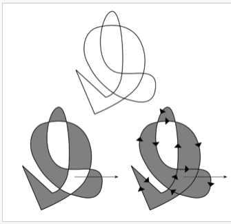 根据两个规则填充曲线(顶部):奇偶规则(左)和非零缠绕规则(右)。