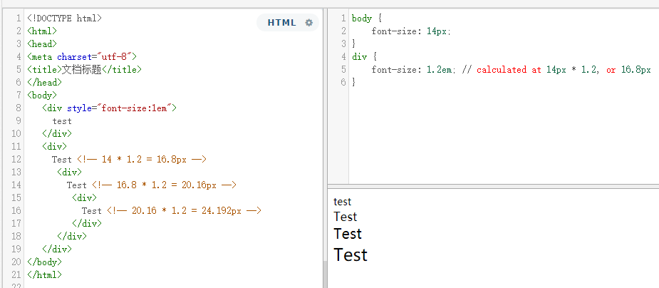 em 定义为相对当前对象(父节点)内容文本的字体尺寸,如给body元素设置了font-size,那么body元素的任何子元素(孙子节点不算)的1 em 就是body设置的font-size大小。当em存在嵌套时,每个div元素都是从它上一级父元素继承大小,并且逐渐增大。